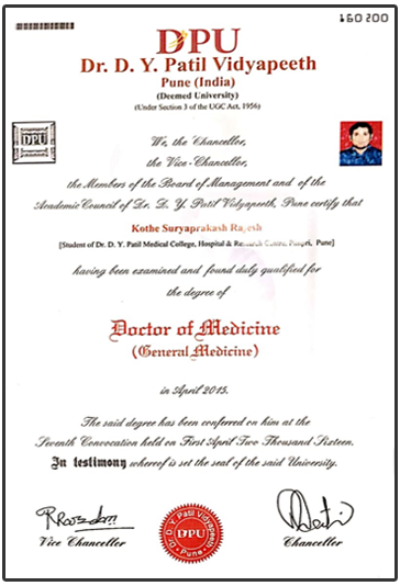 Junior Resident - General Medicine (2012-2015) Dr. D.Y Patil Medical college and Hospital, Pimpri, Maharashtra